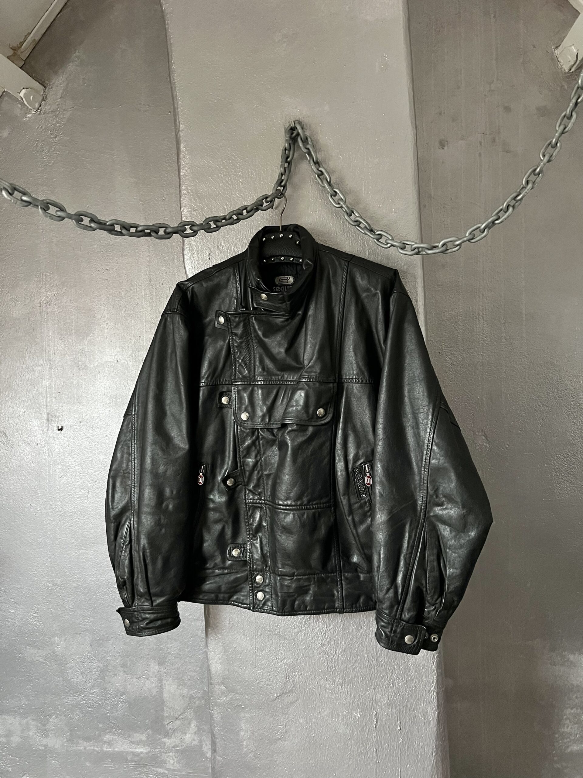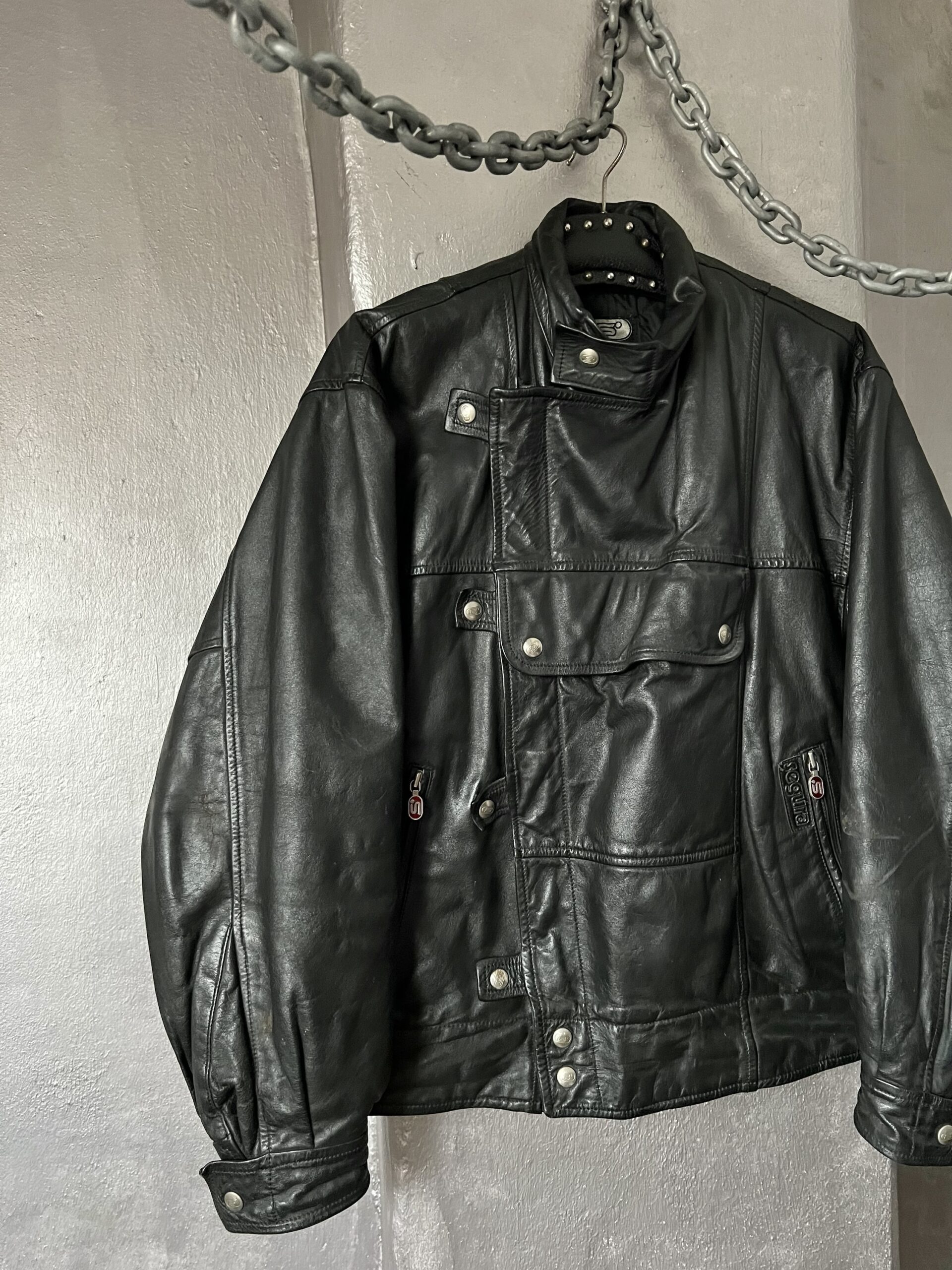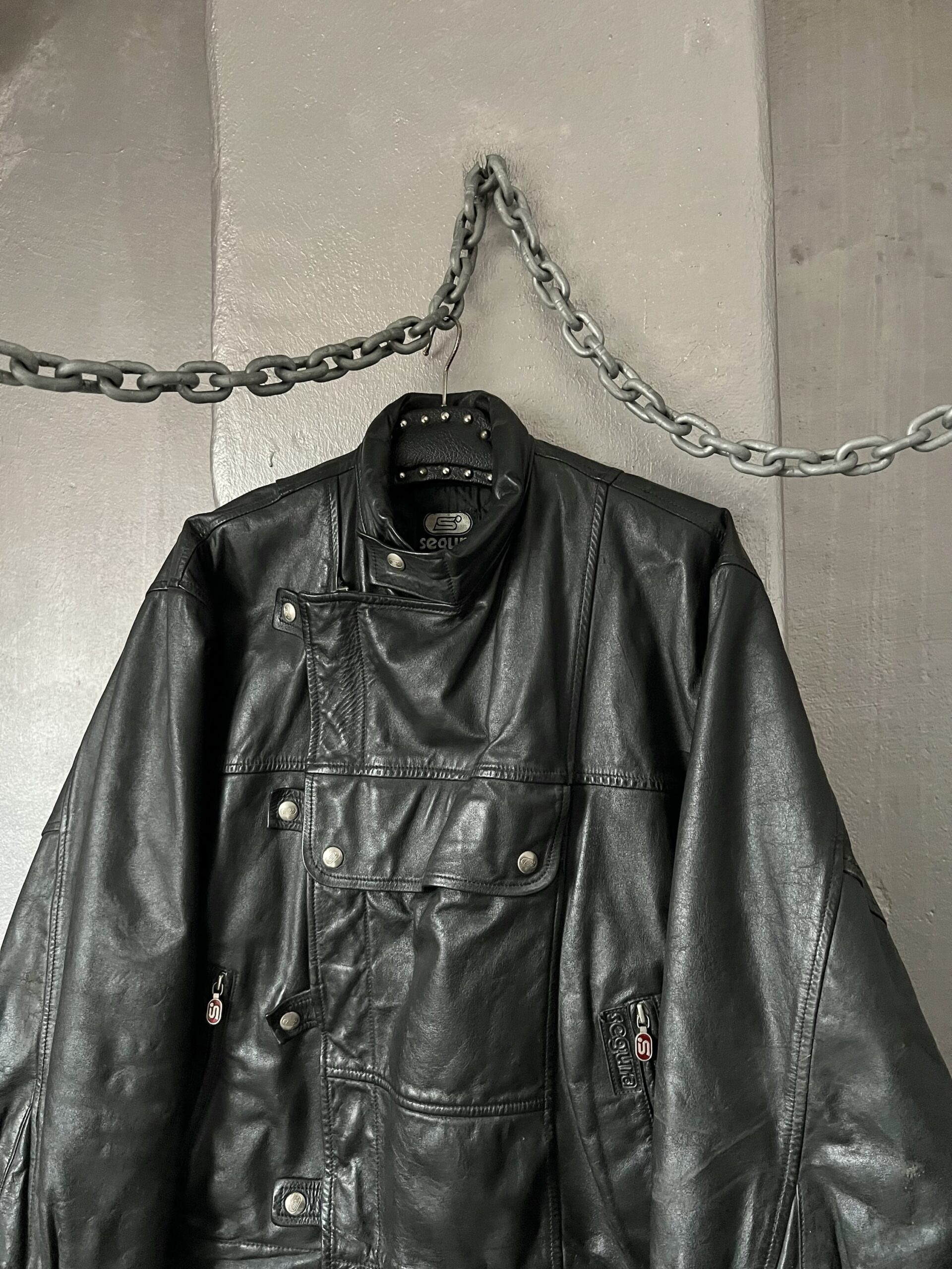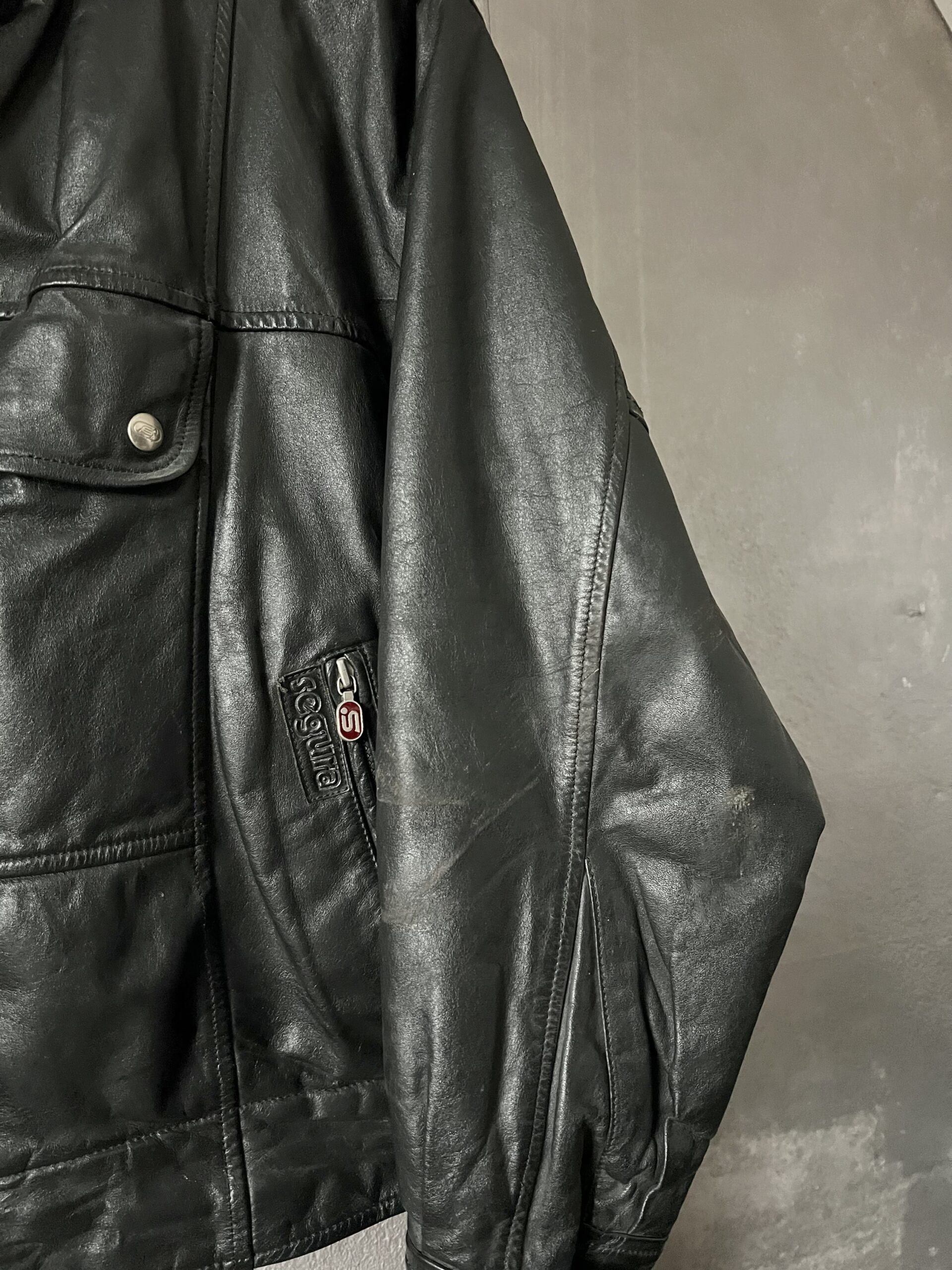 Vintage oversized real leather funnel neck bomber jacket black