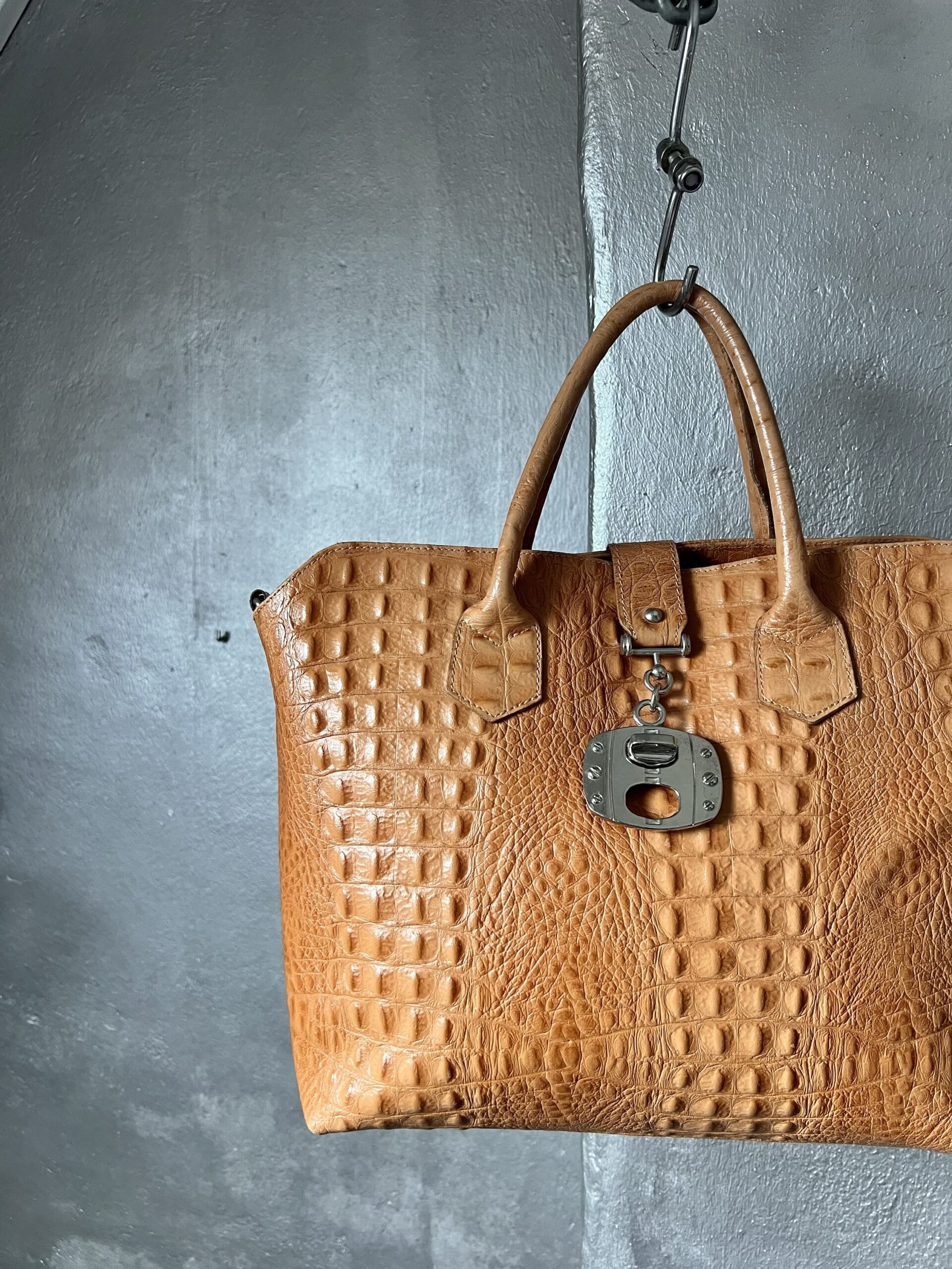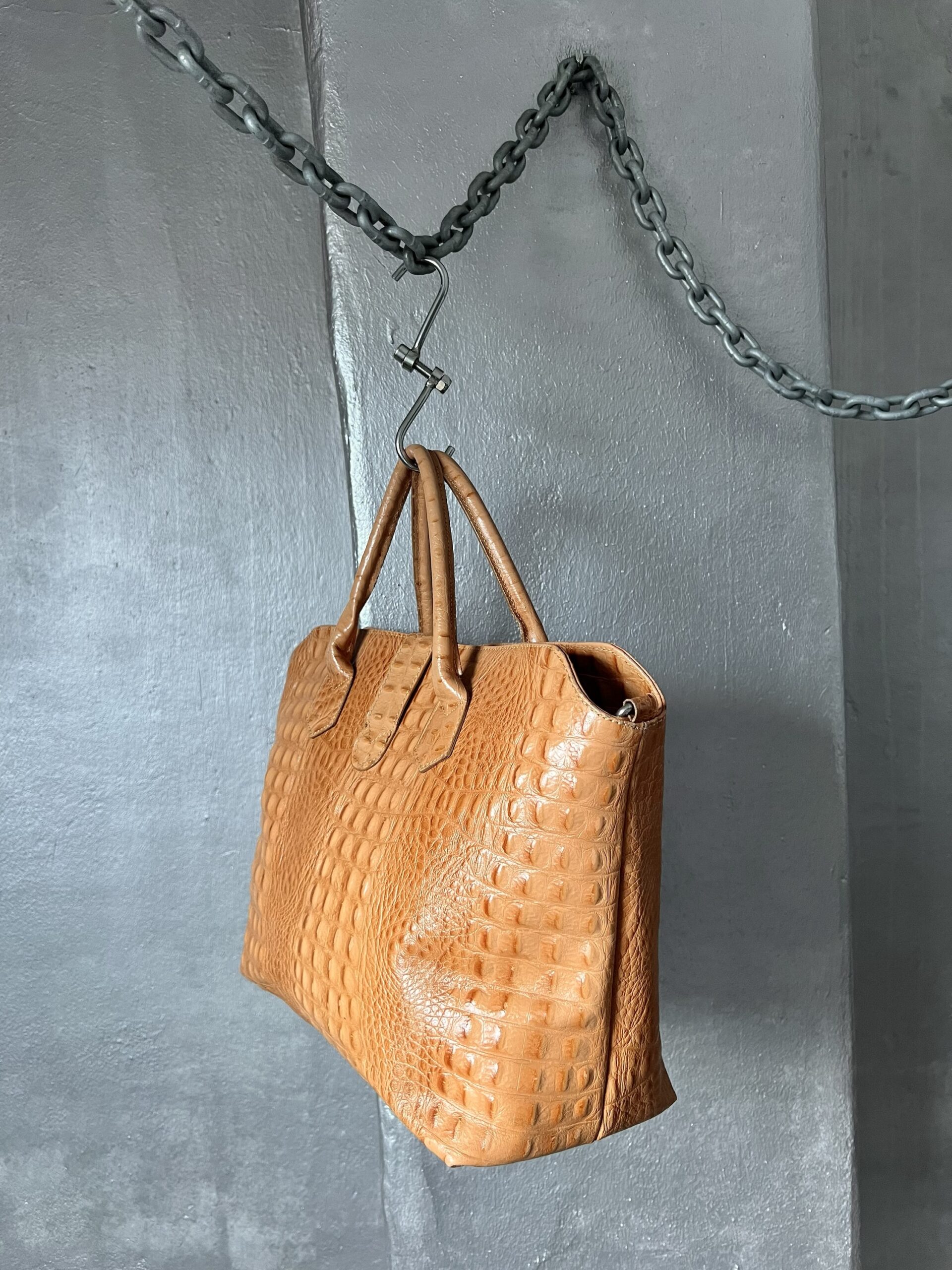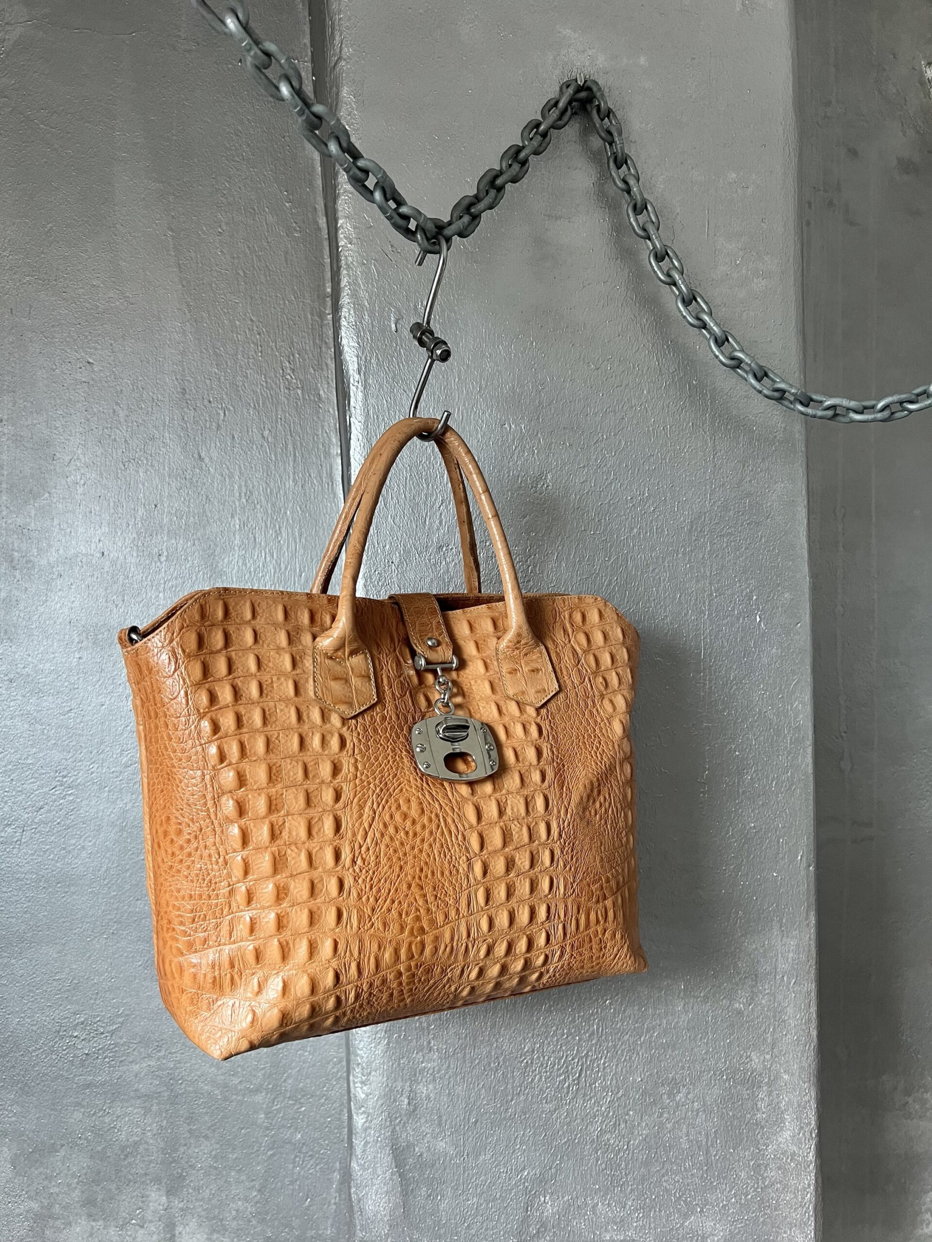 Vintage real leather handbag with crocodile skin cognac orange