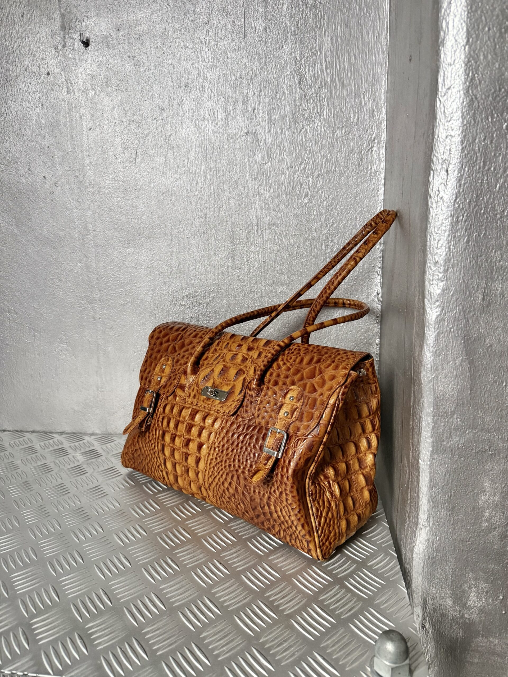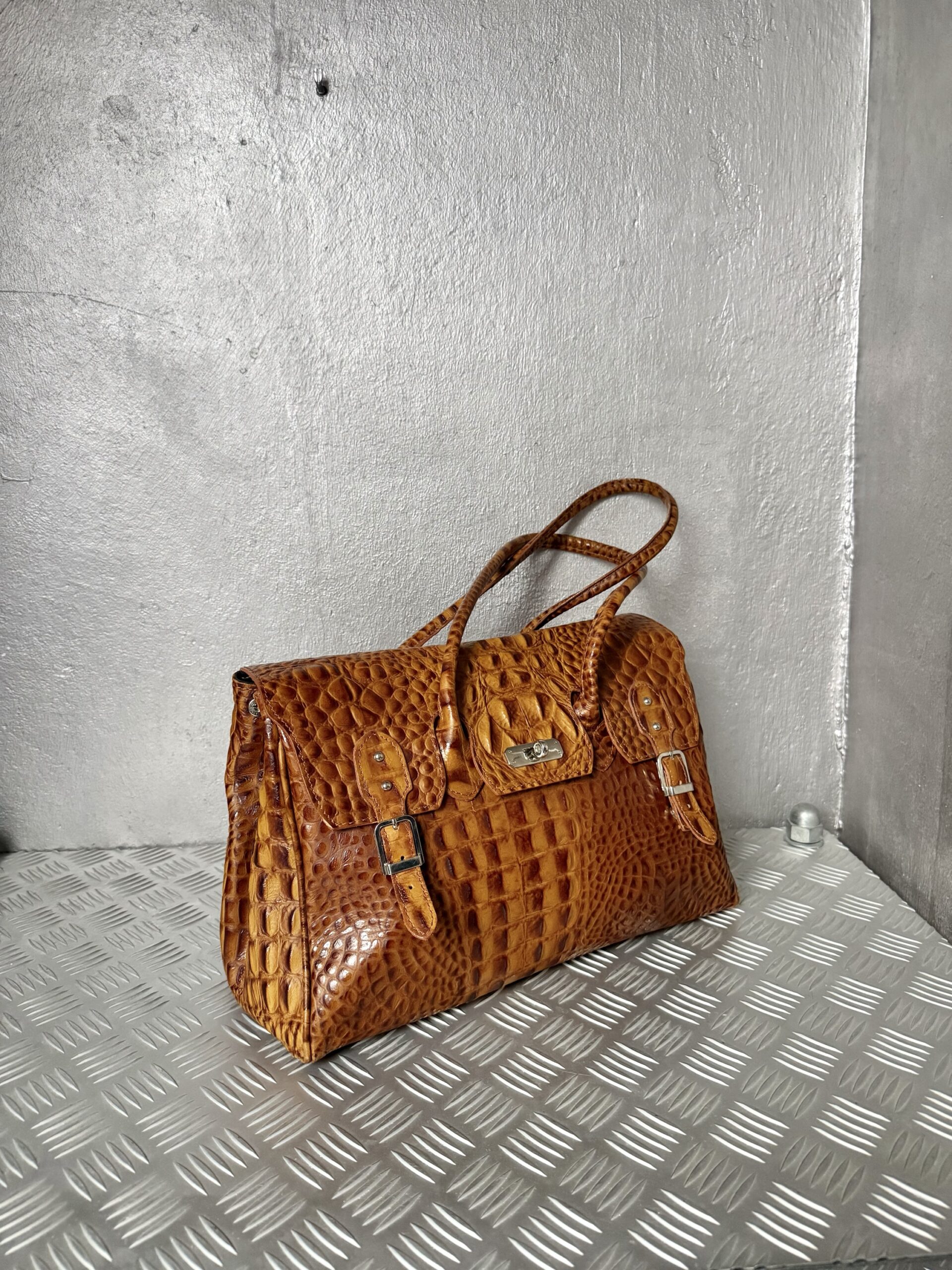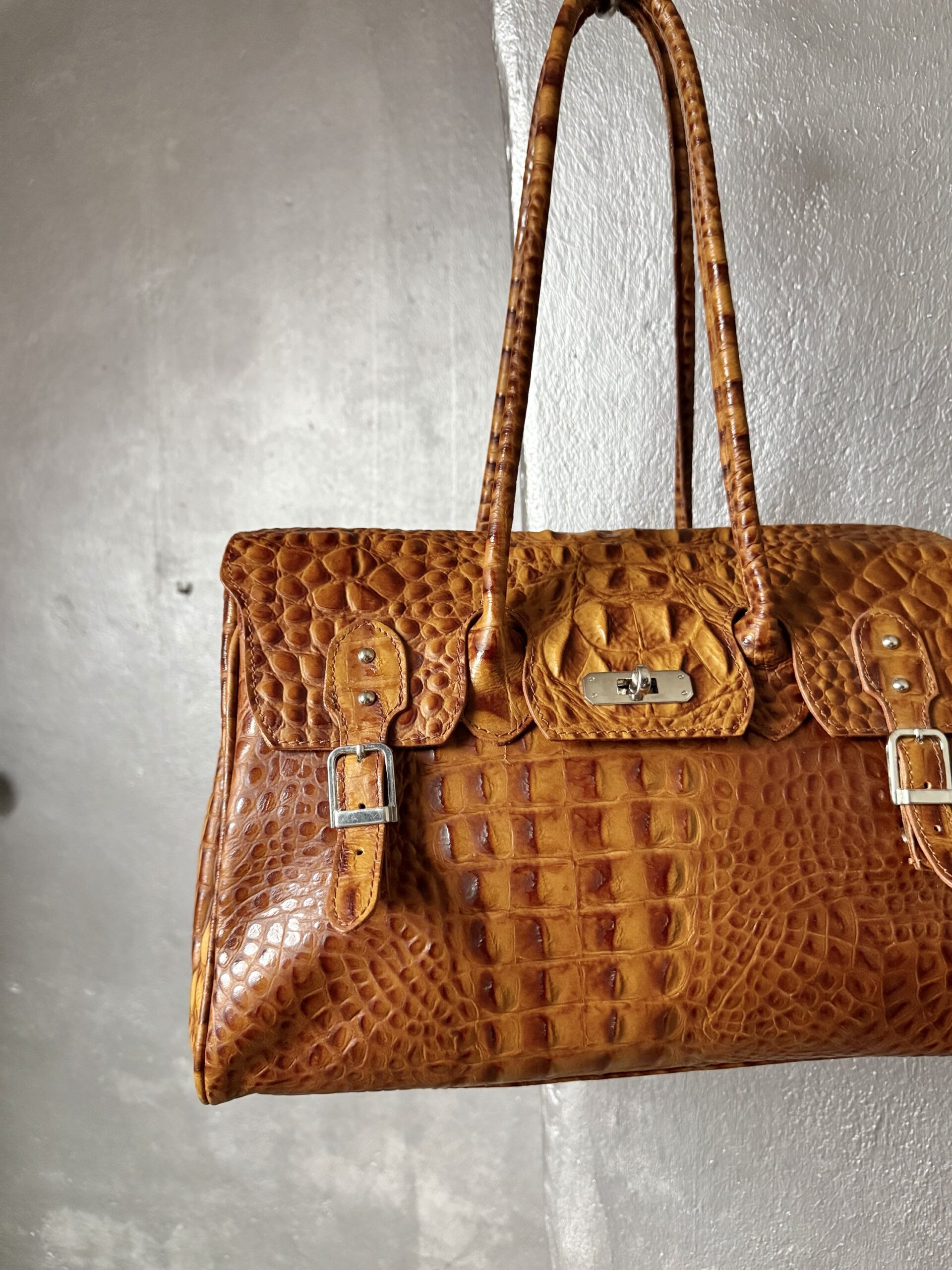Vintage real leather shoulderbag with crocodile skin cognac brown