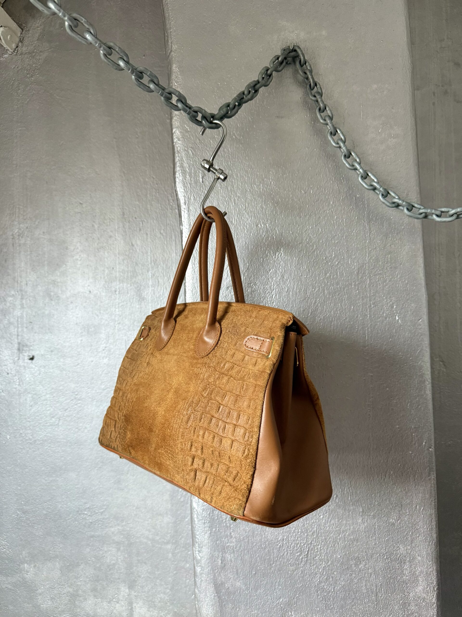 Vintage real leather suede handbag with crocodile skin brown